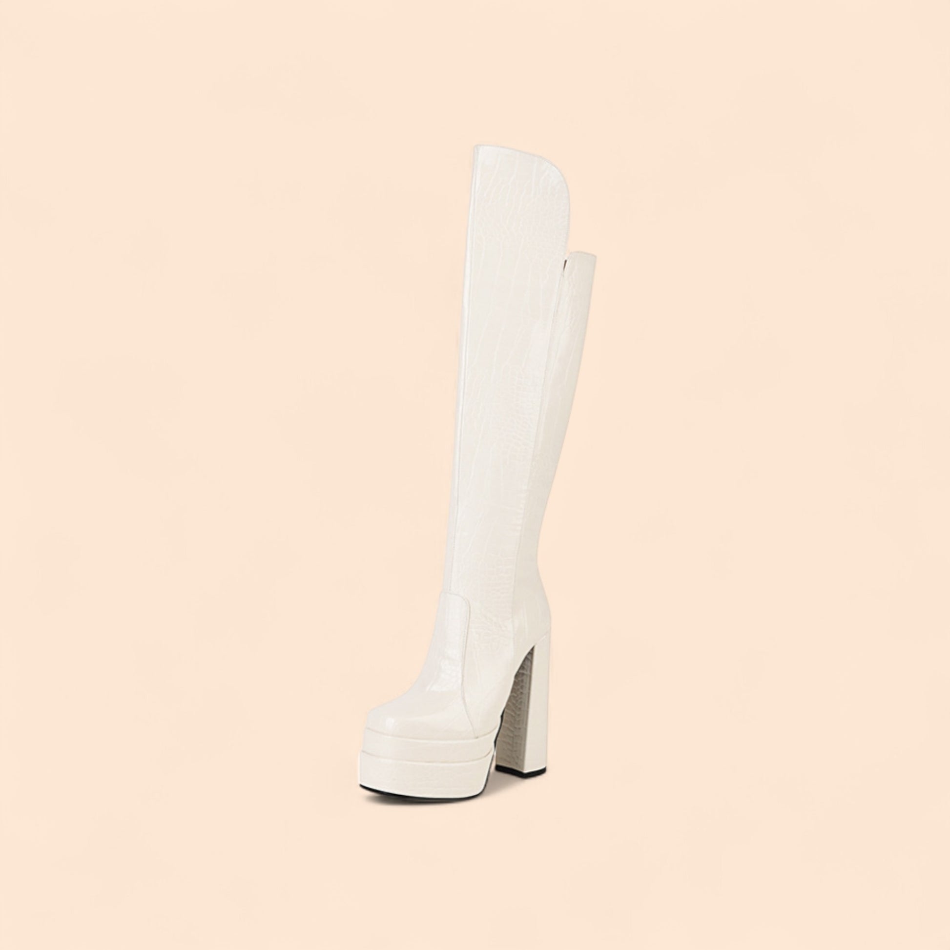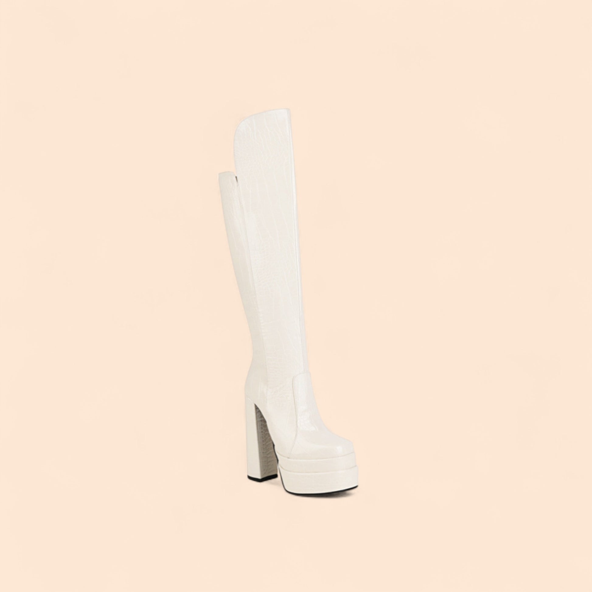 Las botas blancas plataforma Astral combinan el poder de una bota alta con el atractivo visual de una plataforma robusta. Su diseño ajustado hasta la rodilla y su acabado efecto piel las convierten en una pieza statement para looks atrevidos y sofisticados. El color blanco aporta luz y modernidad, mientras que el tacón grueso y la plataforma elevada estilizan la figura con fuerza.