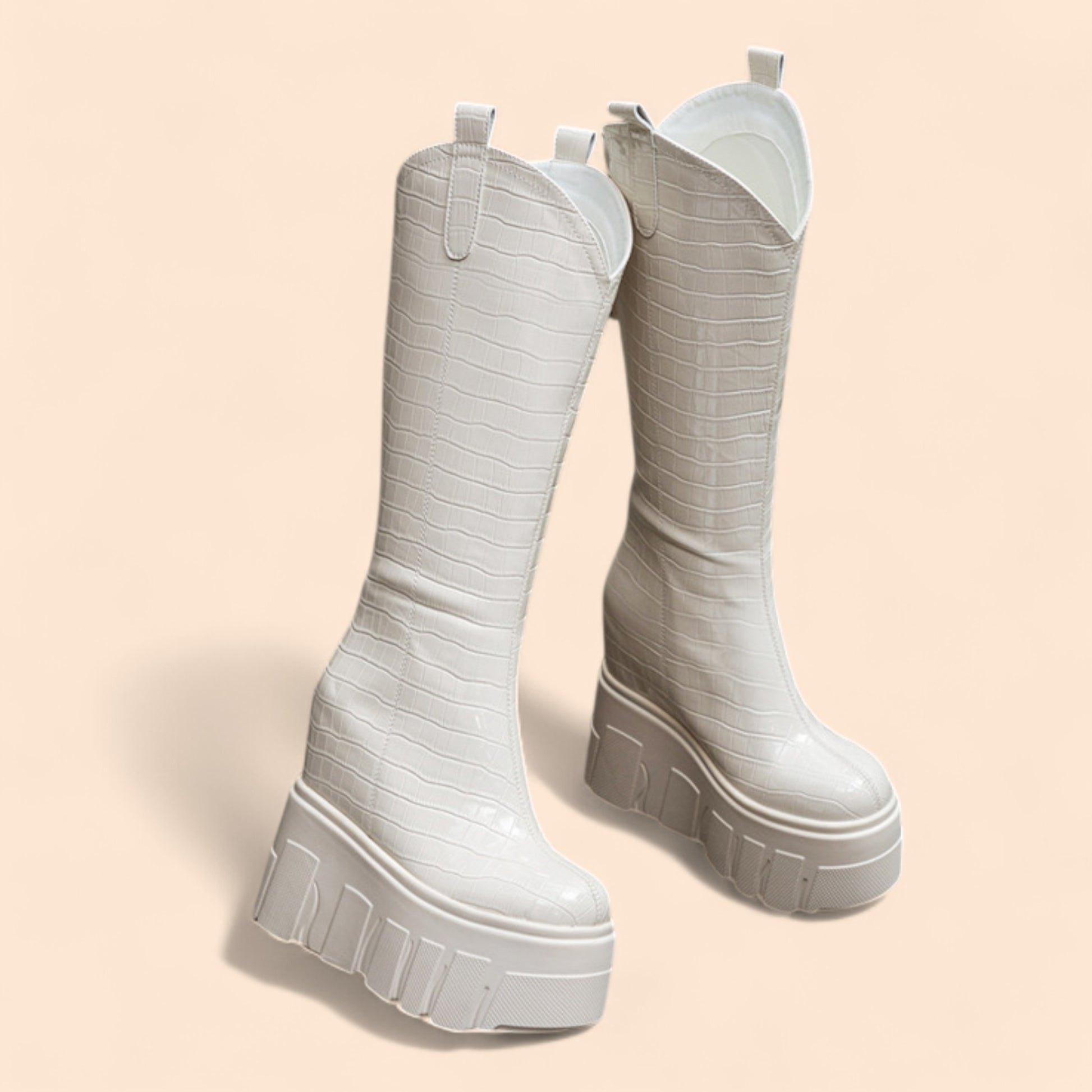Estas botas blancas plataforma destacan por su diseño contemporáneo y su silueta poderosa. La textura efecto cocodrilo, el color blanco luminoso y la suela dentada extra gruesa las convierten en una pieza protagonista que transforma cualquier outfit en una declaración de estilo. El corte alto estiliza la pierna y el tirador trasero facilita su colocación.