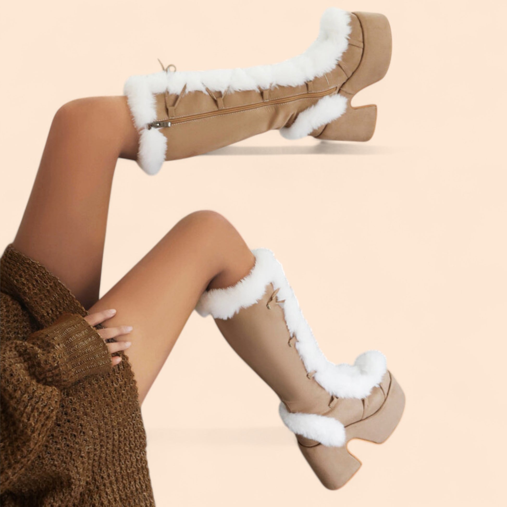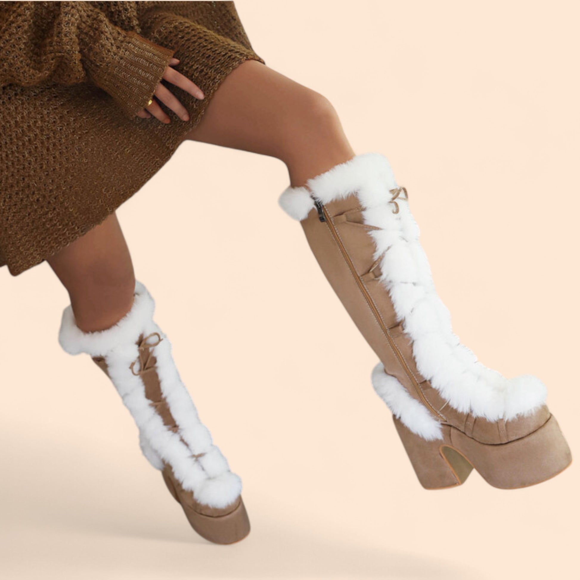 Estas botas Marrones plataforma combinan confort térmico, diseño elevado y una estética cálida perfecta para los días fríos. Su caña alta decorada con pelo sintético blanco, su plataforma robusta y su color neutro las convierten en una opción ideal para looks invernales suaves pero con mucha presencia. El contraste entre el beige y el blanco aporta un aire acogedor y sofisticado.