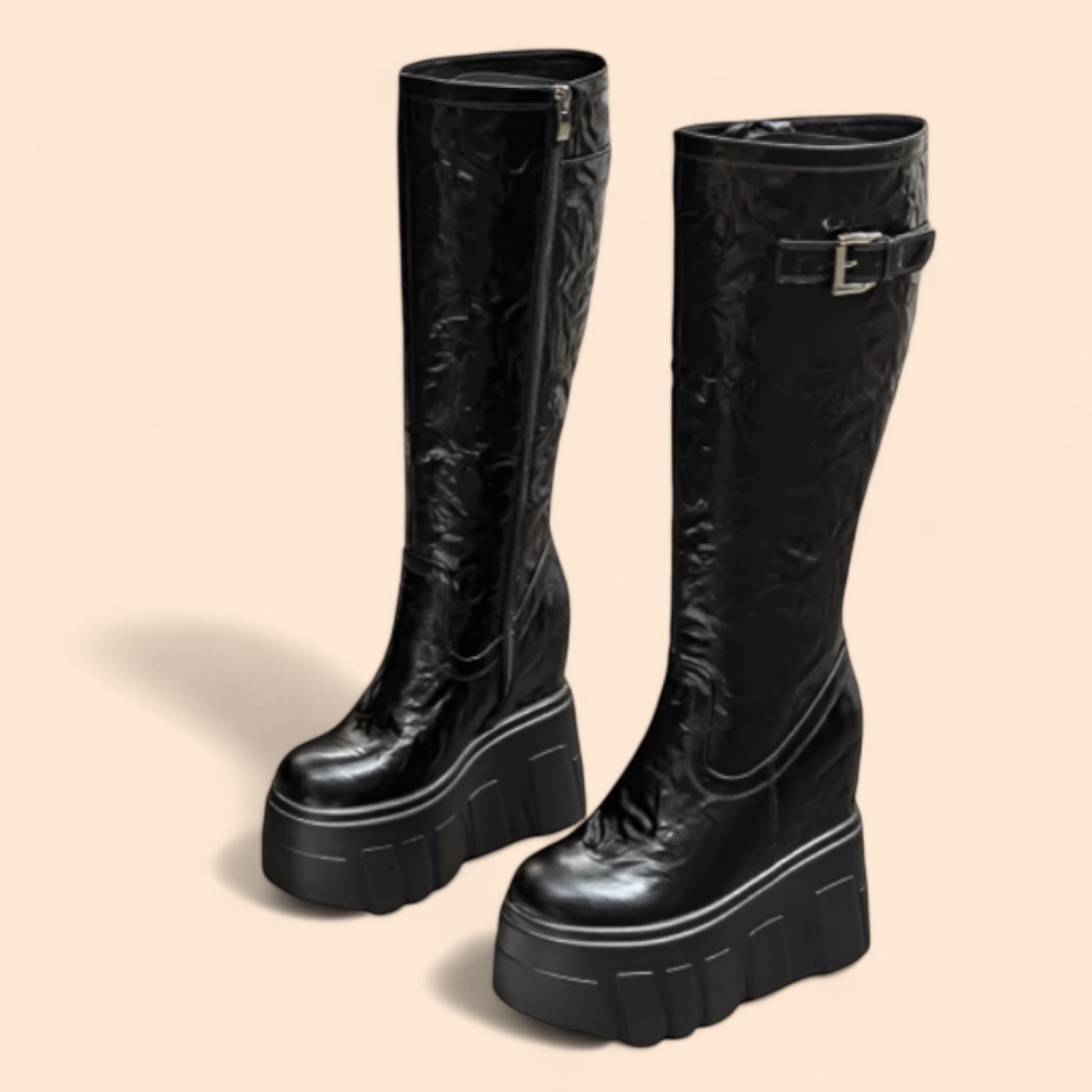 Estas botas negras plataforma son la mezcla perfecta de presencia, altura y estilo contemporáneo. Su acabado brillante con textura sutil, caña alta estructurada y suela gruesa dentada les confiere un aire fuerte y urbano. La hebilla metálica lateral añade un toque decorativo funcional que refuerza su diseño alternativo y moderno.