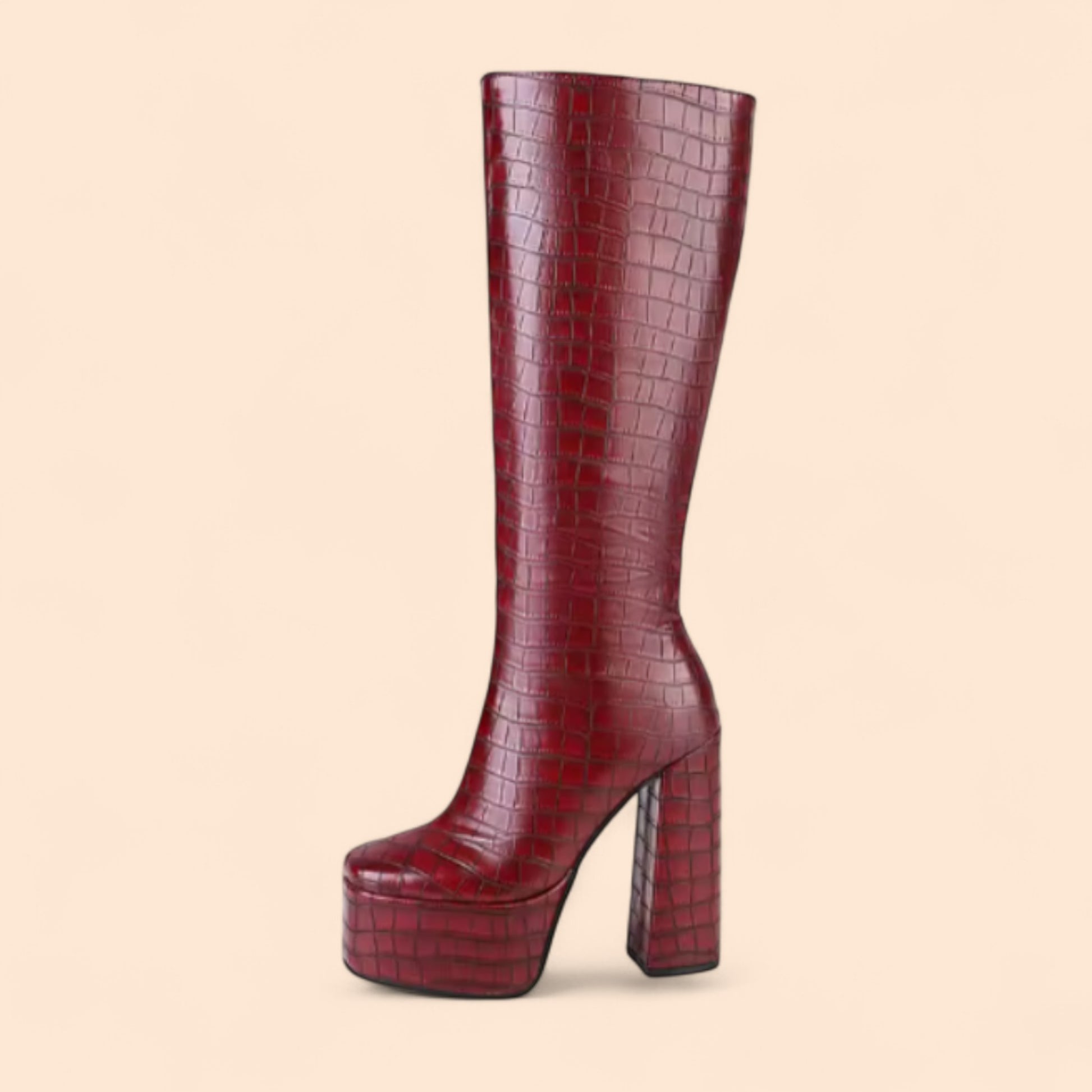 Estas botas rojas con plataforma son la definición perfecta de fuerza y sofisticación. Su acabado efecto cocodrilo brillante, su caña alta estructurada y su tacón grueso elevado hacen de este modelo una pieza clave para quienes no temen destacar. El tono rojo profundo aporta una personalidad única, ideal para elevar cualquier look con un aire vintage y atrevido.