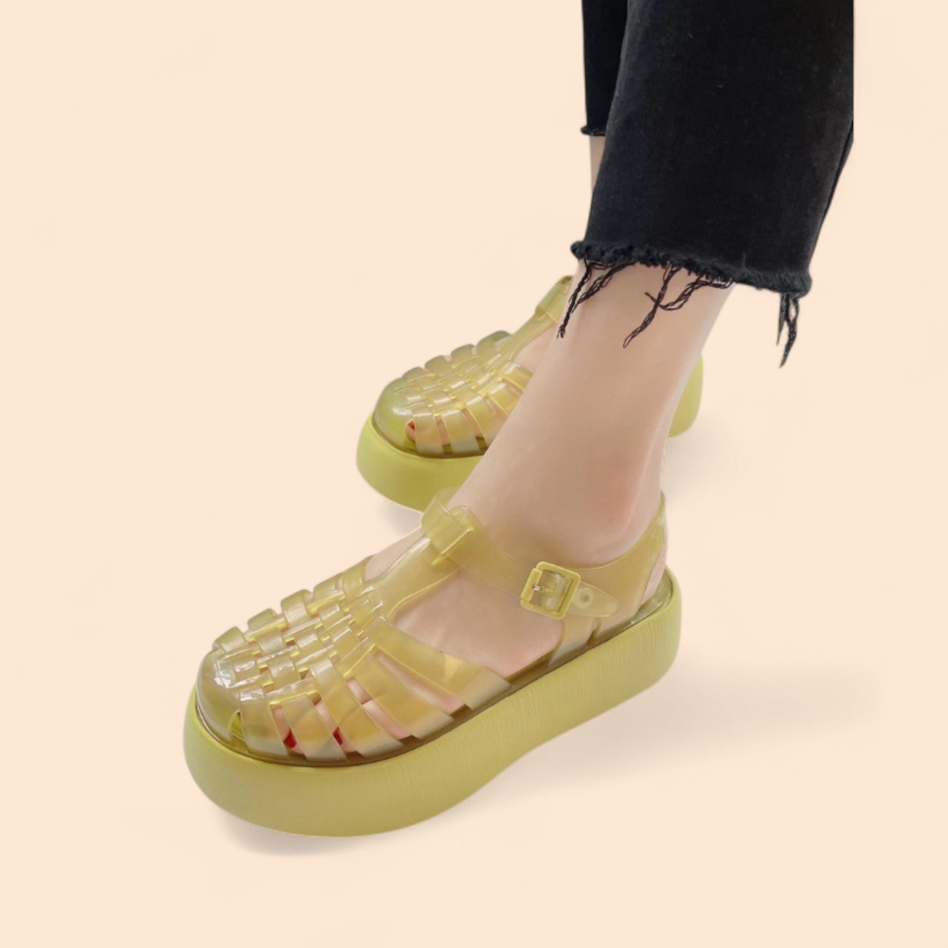 Estas sandalias amarillas plataforma son la opción perfecta para quienes buscan un diseño único, divertido y con altura. Su estructura ligera y su acabado translúcido aportan frescura y un toque moderno que no pasa desapercibido. Ideales para destacar en los días más soleados.