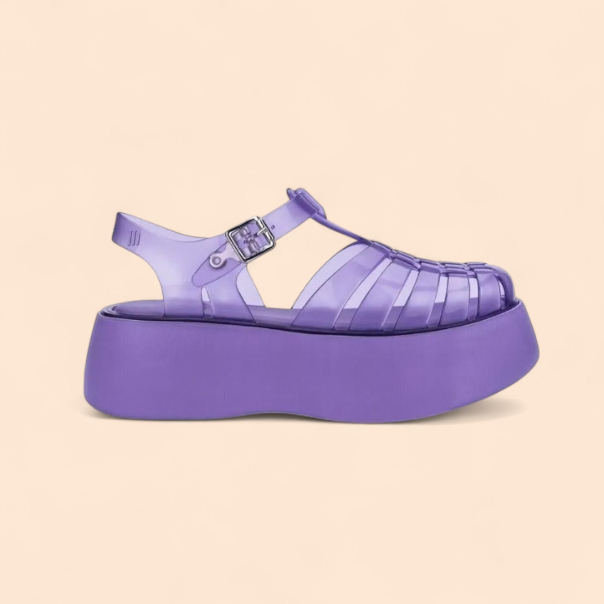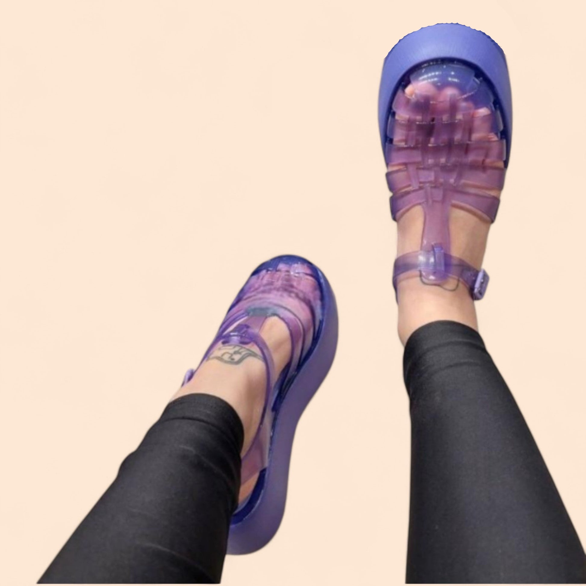 • Sandalias moradas plataforma con diseño tipo jelly.