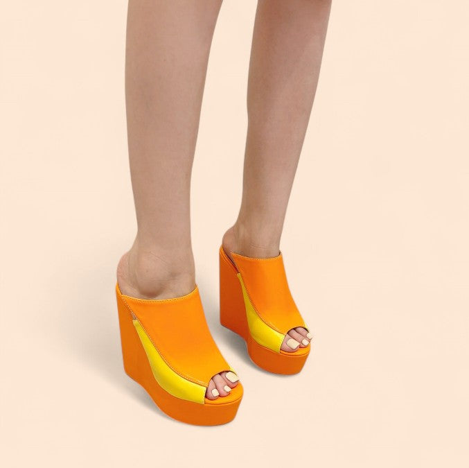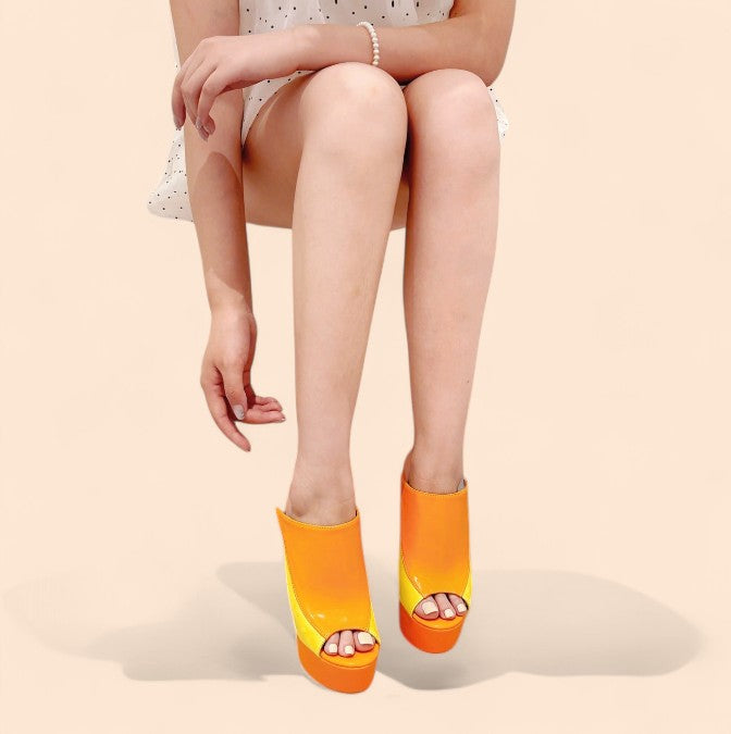 Estas sandalias naranjas plataforma en tonos naranja y amarillo son puro fuego. Perfectas para quien no teme destacar, combinan una silueta moderna con una explosión de color que enciende cualquier look.