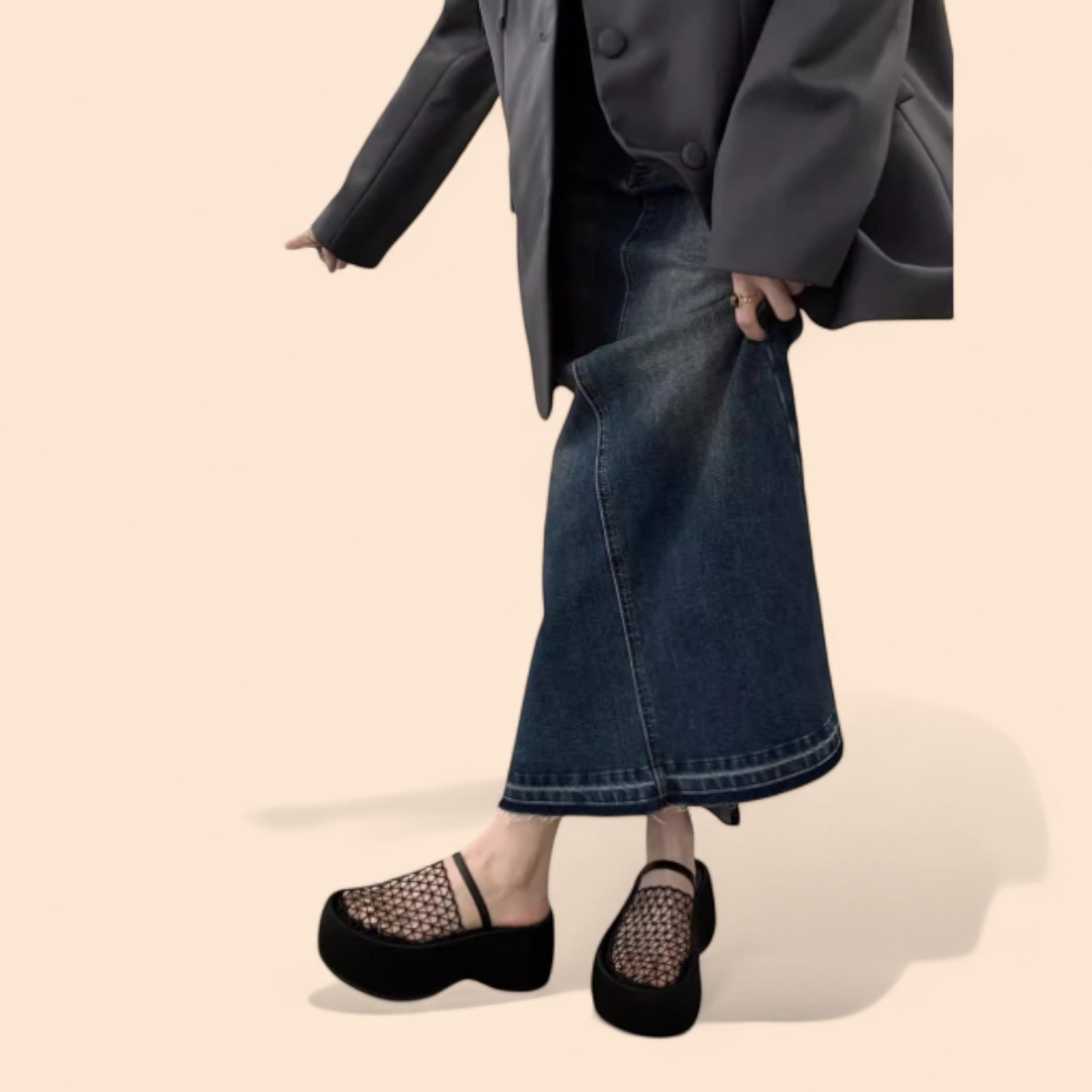 Las sandalias negras con plataforma Alzada son el calzado ideal para quienes buscan un look moderno, atrevido y lleno de carácter. Su diseño innovador con acabado en red aporta un aire sofisticado y urbano, mientras que la plataforma alta estiliza la figura y realza la pierna sin renunciar a la comodidad. El color negro, atemporal y elegante, convierte a este modelo en un imprescindible para looks versátiles que van desde un outfit casual hasta uno más nocturno y chic.