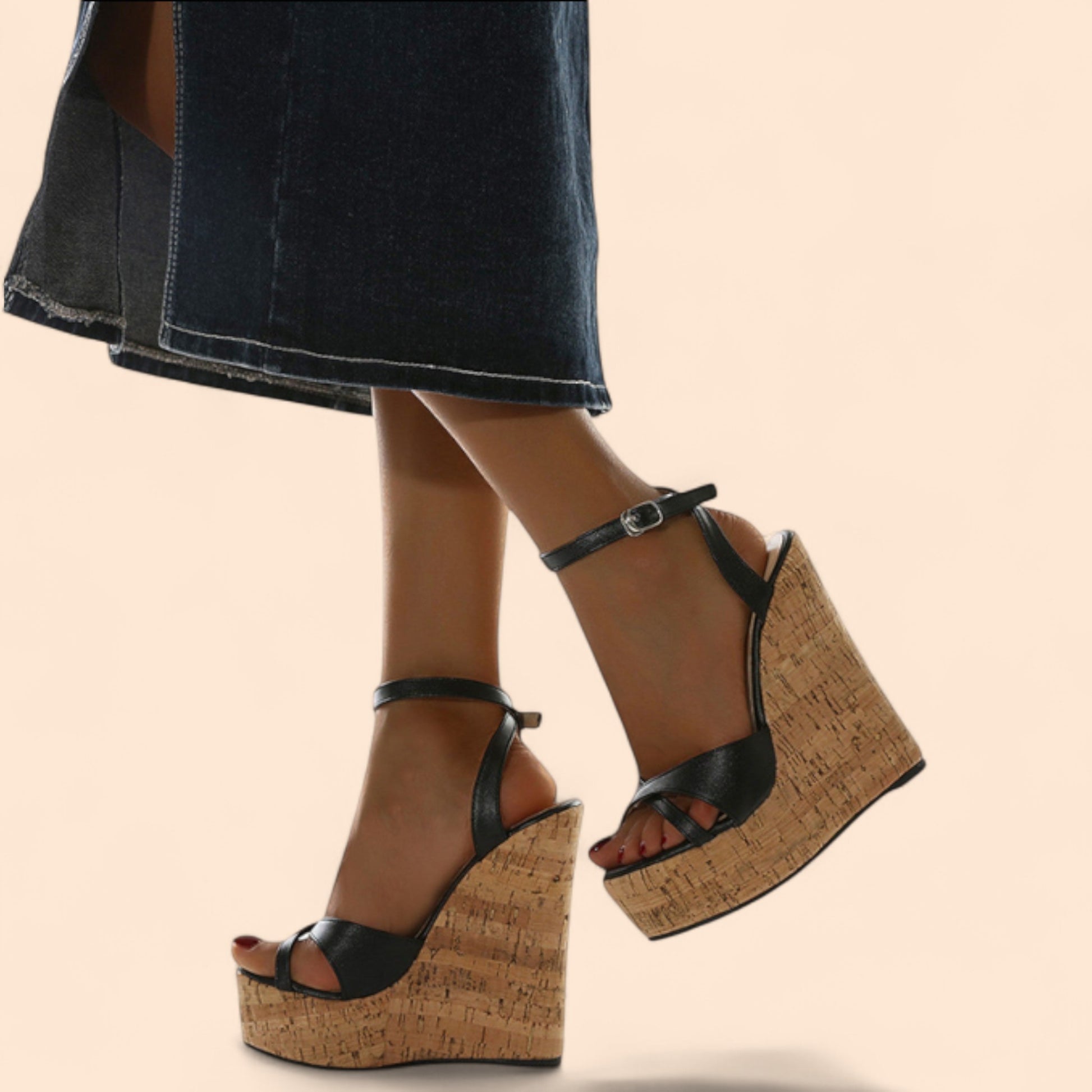 Estas sandalias negras plataforma combinan un diseño sofisticado con materiales que evocan la frescura del verano. La cuña efecto corcho aporta altura con ligereza, mientras que las tiras negras estilizan el pie y aseguran un ajuste cómodo. Ideales para looks urbanos, bohemios o veraniegos, son ese básico elegante que nunca falla cuando buscas altura y comodidad a la vez.