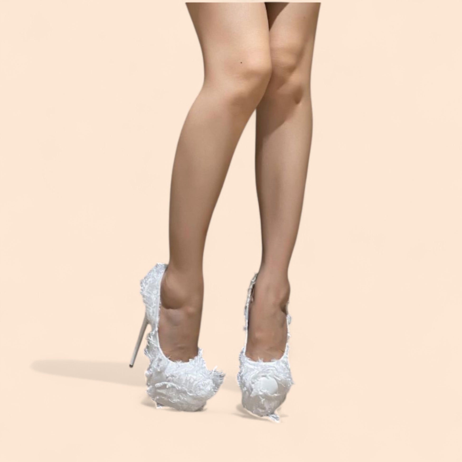- Diseño en blanco nupcial con textura de plumas y brillo sutil: una mezcla de fantasía, lujo y alta costura.