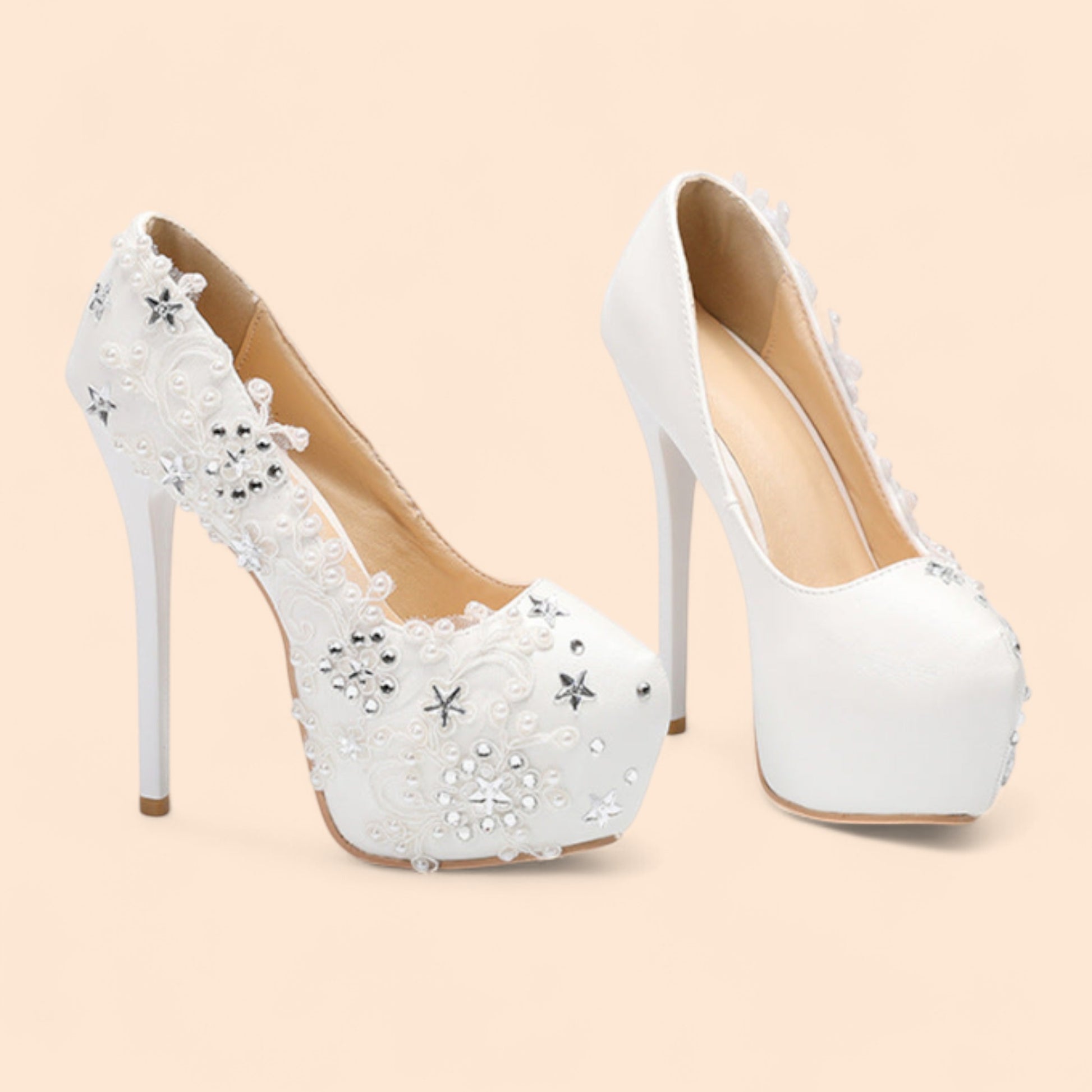 Estas sandalias novia plataforma y tacón de aguja están pensadas para robarse todas las miradas. Bordadas con encaje, perlas y apliques brillantes en forma de estrellas y flores, combinan lo clásico con un toque de fantasía.