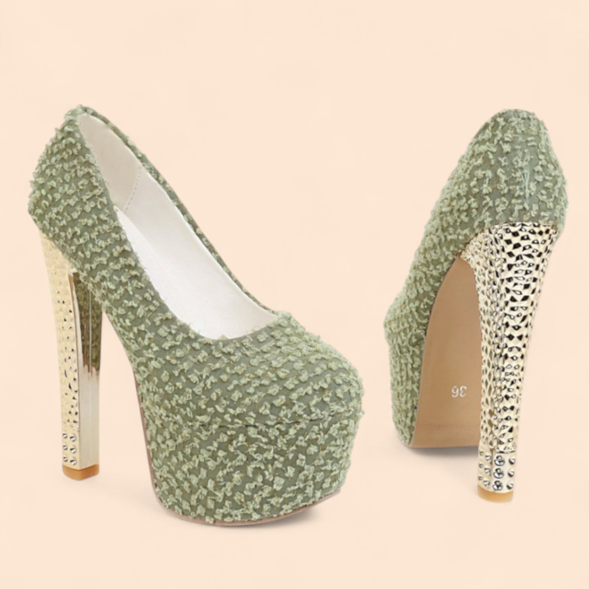 Estas sandalias plataforma verdes son el equilibrio perfecto entre sofisticación y estilo audaz. Su diseño cerrado en la parte delantera y su impresionante tacón dorado alto las convierten en el calzado ideal para eventos especiales, noches de fiesta o estilismos que necesitan destacar. El tono verde suave combinado con texturas brillantes añade frescura y elegancia, sin dejar de captar la atención.