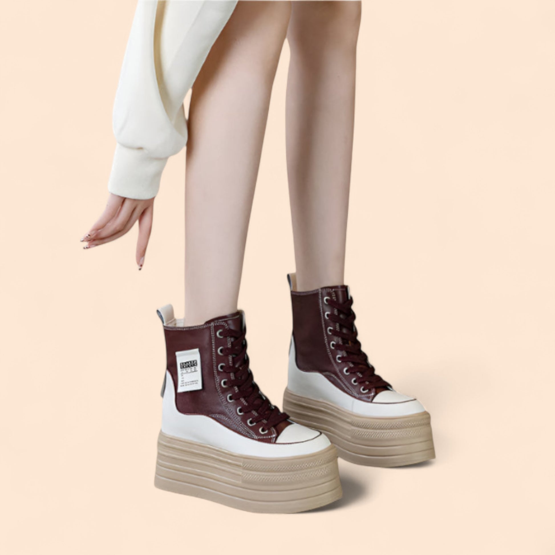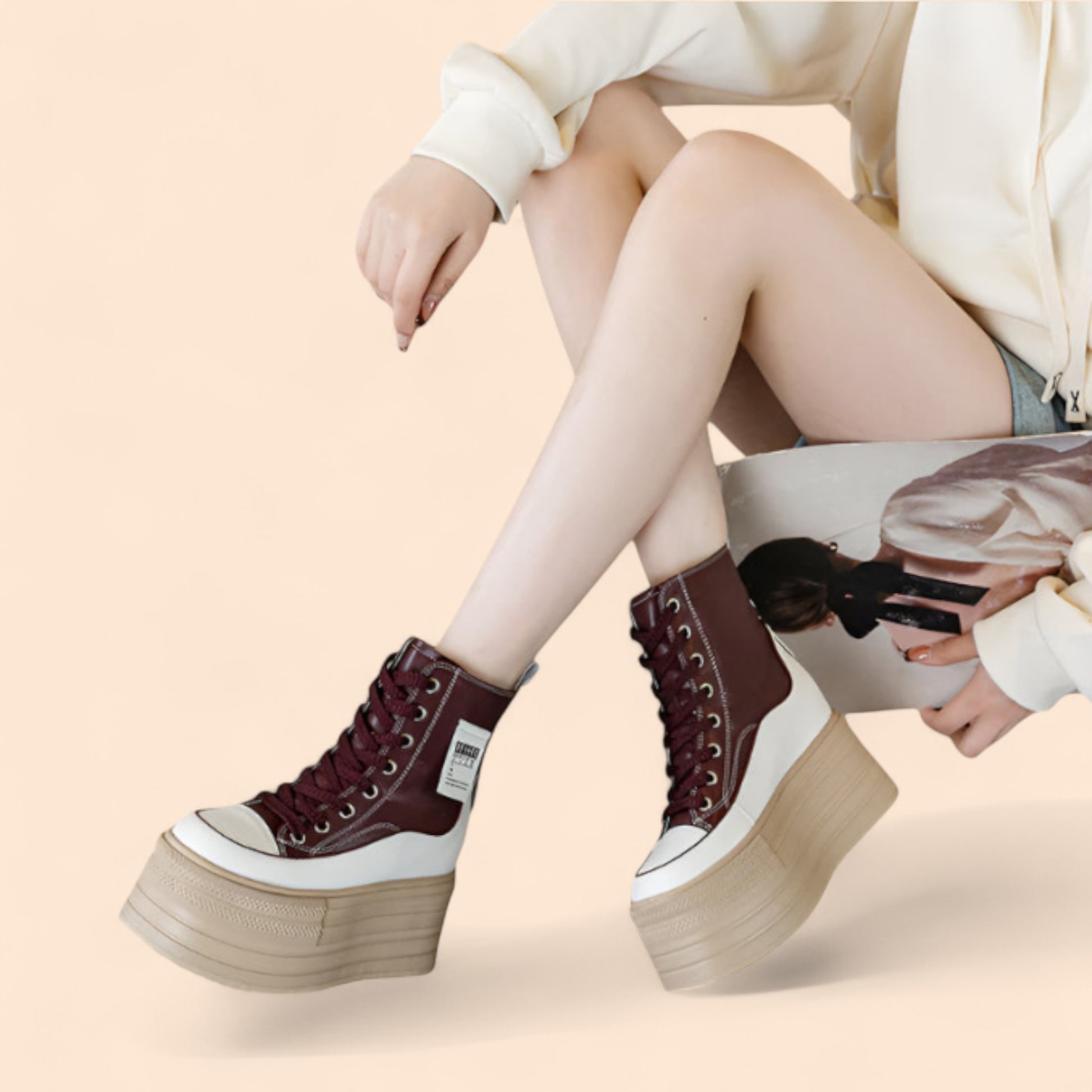 Estas zapatillas marrones plataforma son todo menos discretas. Con su mezcla de tonos chocolate y blanco, cordones a contraste y una plataforma extra alta tipo bloque en color arena, este modelo lleva la estética urbana al siguiente nivel. Su silueta tipo bota, reforzada por el diseño gráfico lateral y una base robusta, ofrece estilo y altura con mucha presencia.