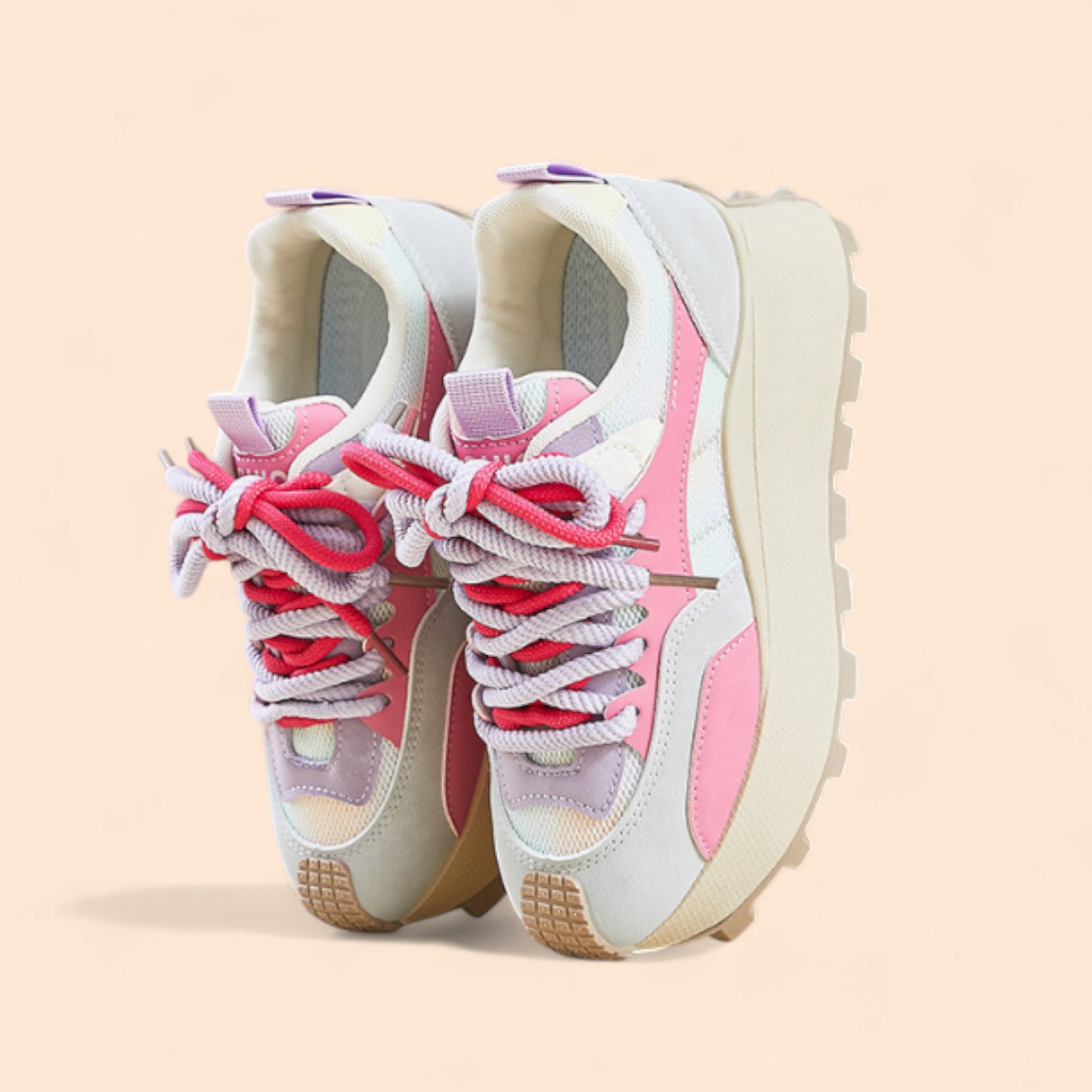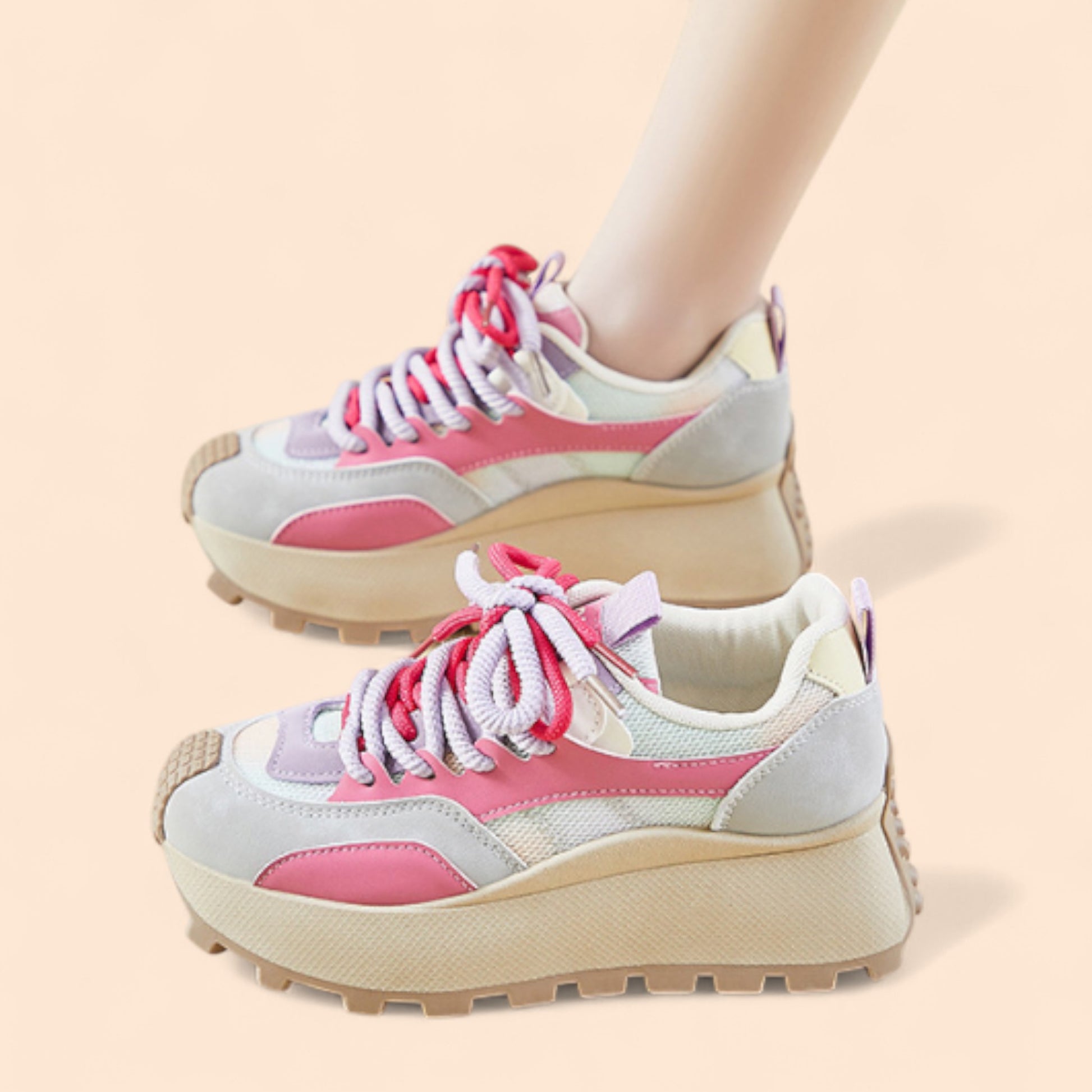 Las zapatillas rosas con plataforma Solea combinan la comodidad de unas deportivas con el toque atrevido y femenino de una plataforma alta. Su diseño moderno mezcla tonos rosas, lilas y beige, creando una armonía perfecta entre dulzura, energía y estilo urbano. Son ideales para quienes buscan un calzado que aporte altura, ligereza y personalidad, sin renunciar al confort diario.