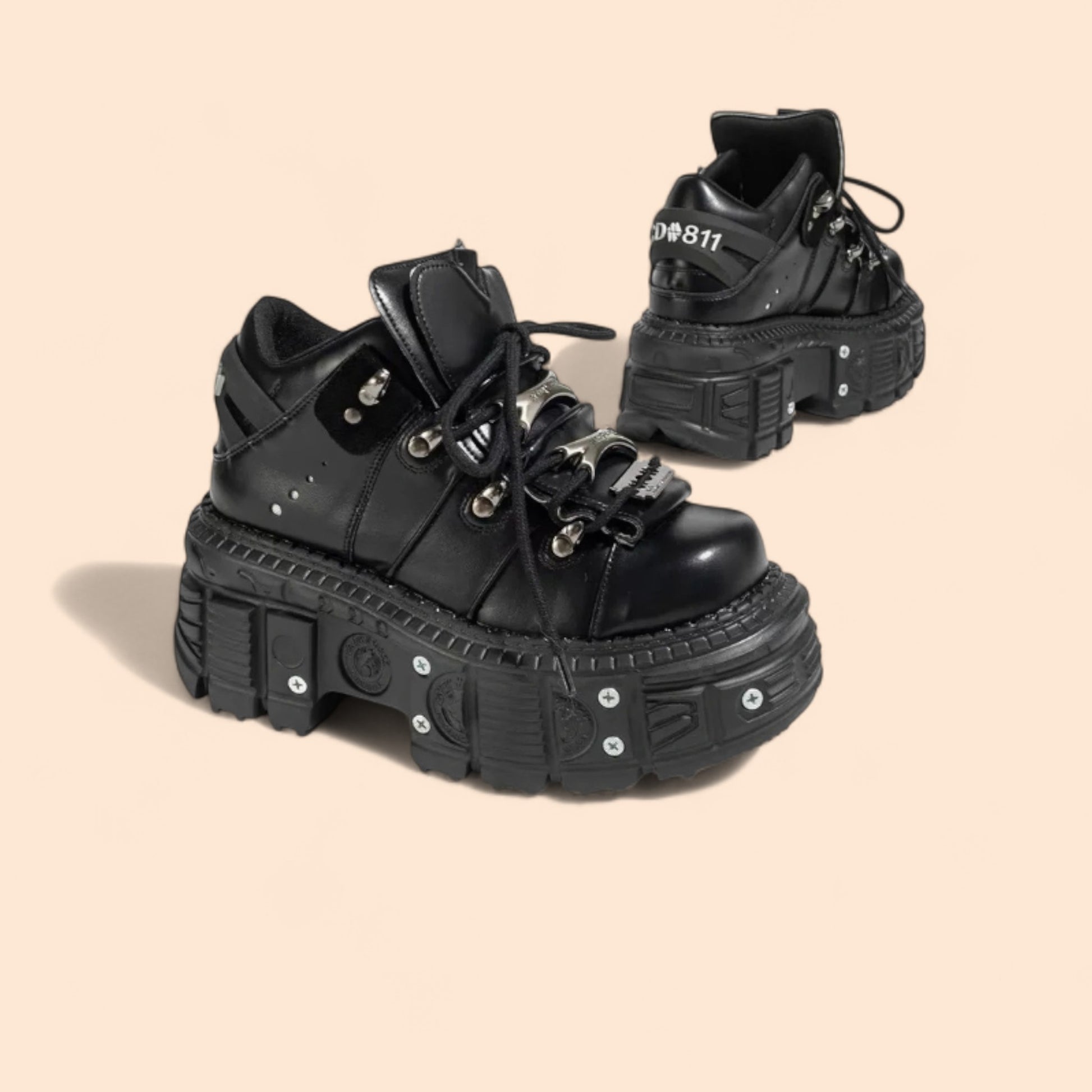 Para las almas más oscuras que pisan fuerte, llegan los zapatos góticos definitivos. Su diseño robusto, inspirado en la estética industrial y cyberpunk, es tan intimidante como seductor. Con su plataforma extrema, sus detalles metálicos y su estructura sobrecargada, no pasarás desapercibida: son una declaración total de fuerza, misterio y rebeldía.